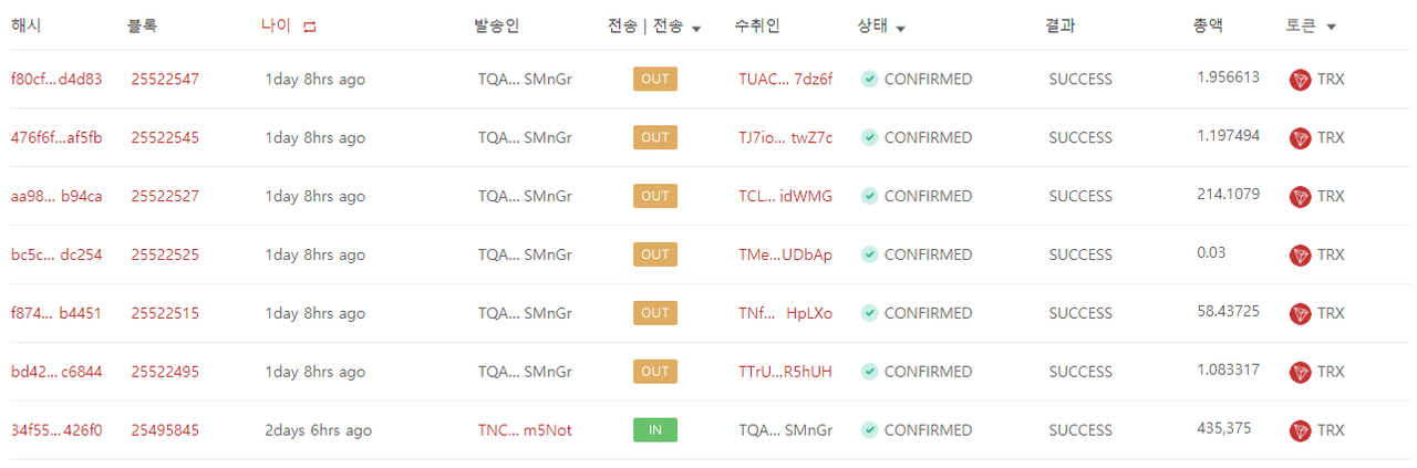 - 트론 전송 트랜잭션 : https://tronscan.org/#/transaction/34f55cfa214f92f995a742b556528385b452bb0c4da3532d9388d7cdba7426f0
