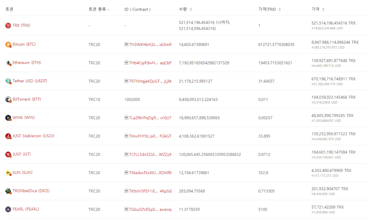 그 뿐만 아니라 BTCTRON이나 테더를 포함하여 정말 다양한 종류의 TRC20 토큰들을 꽤나 많이 보유하고 있다는 것을 확인할 수 있습니다.