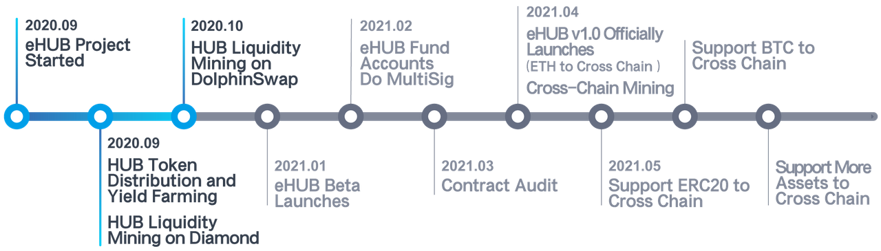 - 2021년 4월 : eHUB 1.0 공식 런칭 (이더리움 크로스체인 기능 지원 / 크로스체인 마이닝)