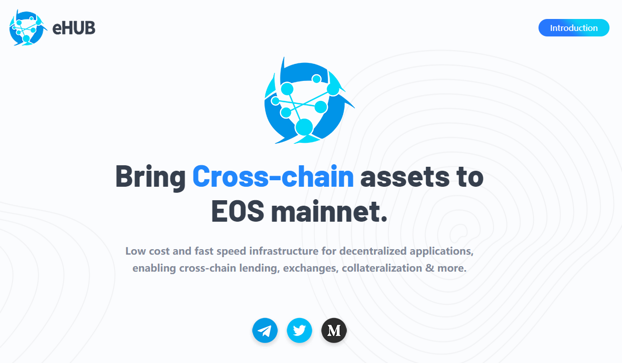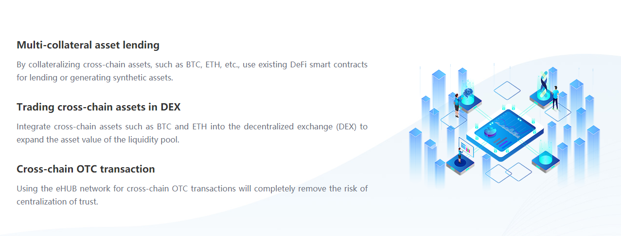 eHUB는 Diamond Finance와 Dolphin Swap, DEOS 등 이오스 메인넷 기반의 다양한 디파이 프로토콜을 개발하고 있는 EFi팀에서 개발하고 있는 크로스체인 디지털애셋 관리 및 거래 프로토콜로 비트코인(BTC), 이더리움(ETH)과 같은 크로스체인 자산의 담보화하고 스마트 컨트랙트를 사용하여 합성자산을 빌리거나 생성 및 거래할 수 있는 기능을 지원하는 것을 목표로 하는 프로젝트입니다.