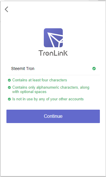 ④ 트론링크 월렛에 표시될 지갑의 이름을 입력해주세요. 꼭 스팀잇 계정으로 입력할 필요는 없고 내가 알아보기 편하게 입력하시면 됩니다. 위에서는 Steemit Tron이라고 이름을 넣어봤습니다.