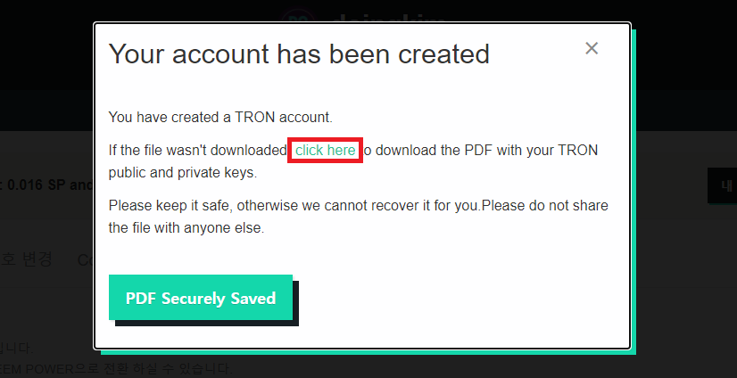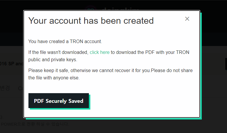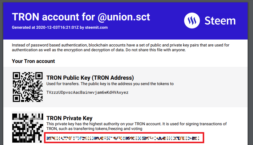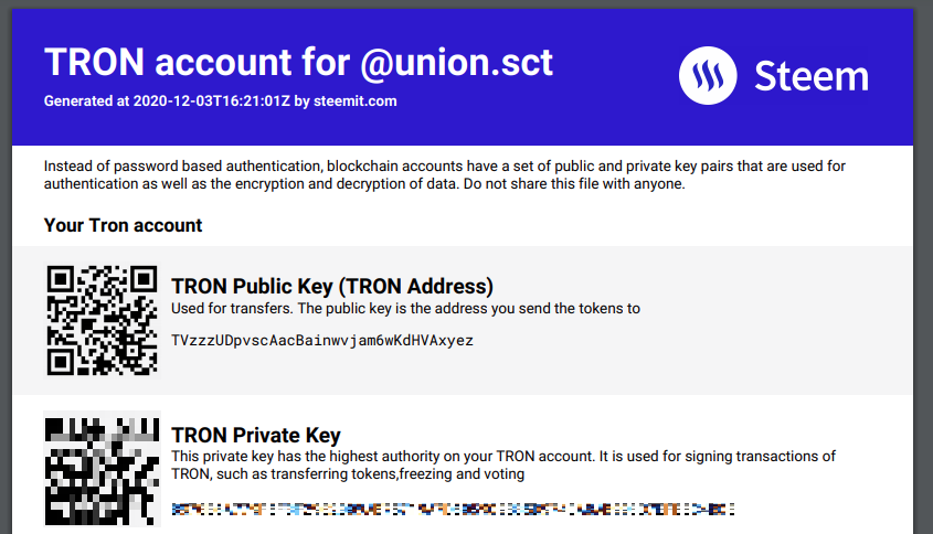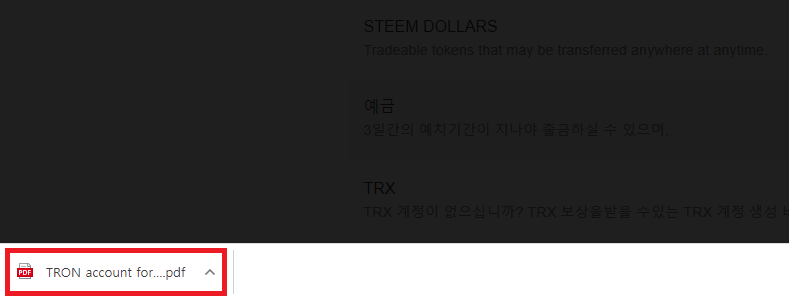 [참고] 이 PDF파일에는 내 스팀잇 월렛에 연결되는 트론 계정의 프라이빗키 정보가 담겨져 있습니다. 반드시 안전하게 잘 보관하셔야 합니다.