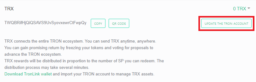 ⑦ 절대 화면 오른쪽에 보이는 [UPDATE THE TRON ACCOUNT] 버튼을 클릭하지 않도록 주의하세요.