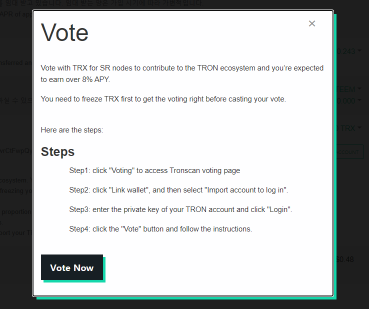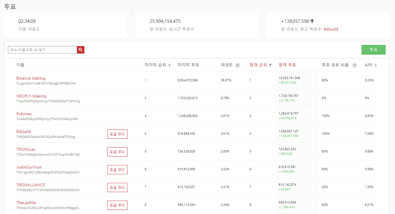 추가 보상으로 받은 TRX를 스테이킹하고 트론의 SR(Steem으로 따지면 증인(Witness)) 투표에 참여하고 연환산이자율 8% 정도의 수익을 얻을 수 있습니다. 다만, 투표의 경우에는 트론링크 월렛과 같은 트론 지갑앱을 사용해야만 합니다.