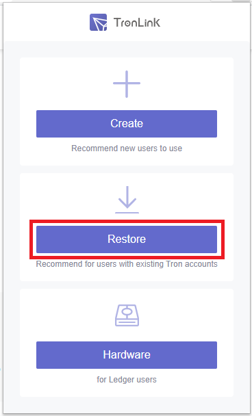 ③ 우리는 트론 계정을 이미 생성했으므로, [Restore] 버튼을 클릭하여 트론 계정 불러오기를 진행합니다.