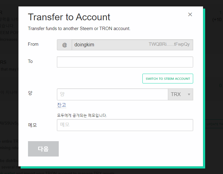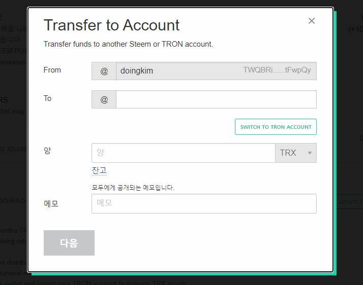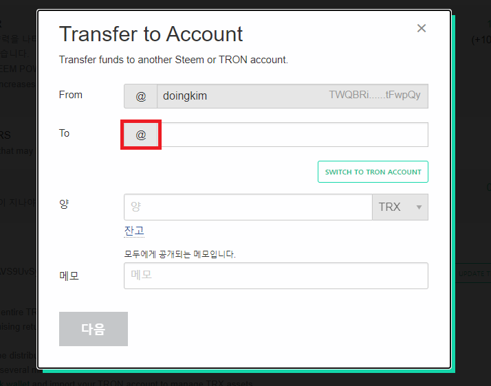 ③ [SWITCH TO TRON ACCOUNT]버튼을 클릭하면 위와 같이 받을사람 계정명 앞에 @가 빠지게 되는데, 이때는 T로 시작하는 트론의 지갑 주소를 입력하여 트론 지갑이나 거래소로 TRX 전송이 가능합니다.