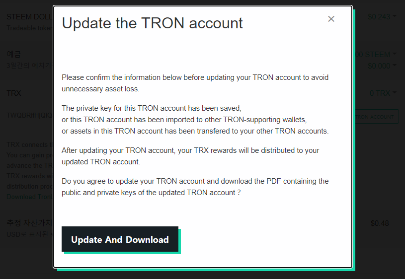트론 계정을 업데이트하는 경우에는 이후부터의 TRX보상이 새롭게 업데이트된 계정으로 지급되며, 내 스팀잇 계정에 연결되어 있던 원래의 트론 계정의 프라이빗키를 별도로 잘 저장해놓지 않은 경우에는 이전 계정에 있던 TRX를 잃어버릴 수 있으므로 주의해야 합니다.