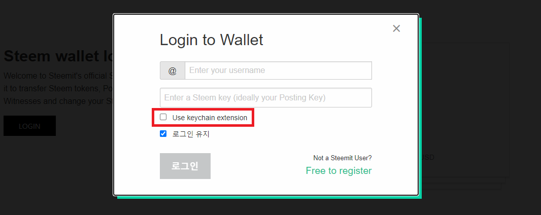 ① 스팀잇 월렛(https://steemitwallet.com/)에 접속하고 로그인을 합니다. 이때 키체인을 통한 로그인 선택을 해제하시고 직접 프라이빗키를 입력하는 방식으로 로그인을 하셔야 합니다. (프라이빗키는 액티브키로 로그인하시면 됩니다)