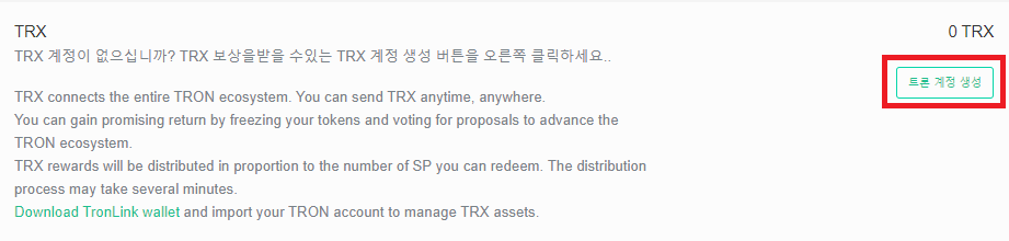 [참고] 만약 위와 같은 화면이 바로 뜨지 않는 분들은 스크롤을 아래로 내리시면 [트론 계정 생성]이라는 탭을 클릭하시면 됩니다.