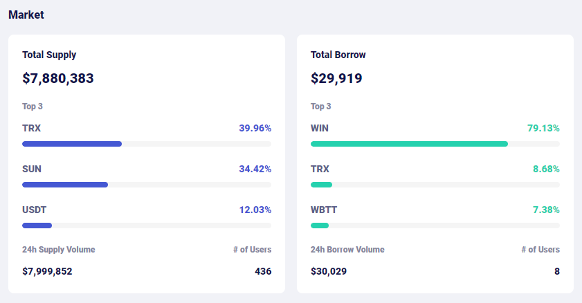 아직 출시된지 30분 정도밖에 되지 않았으나 벌써 800만 달러 정도에 해당하는 토큰들이 예치가 되었고, 트론, 썬, USDT 순으로 예치가 많이 된 것으로 나타나고 있습니다. 실제 차입은 약 3만 달러 정도만 이뤄졌으며 차입 거래의 대부분은 WIN이 차지하는 것으로 나타나고 있네요.
