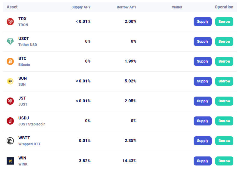 출시 초기에 렌딩을 지원하는 토큰은 트론(TRX), 테더(USDT), 비트코인트론(BTC), 썬(SUN), 저스트(JST), 디제이(USDJ), 비트토렌트(WBTT), 윙크(WIN)까지 총 8개 종류의 토큰이며, 해당 토큰들 중에서 차입 이자비용보다 더 높은 이율을 얻을 수 있는 일드 파밍 등의 용도로 사용할 수 있는 WIN의 이율이 가장 높은 것으로 나타나고 있습니다.