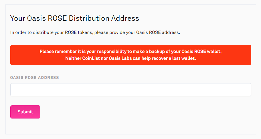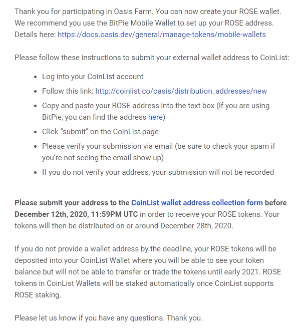 오아시스 로즈 가든에 참여하신 분들은 어제 위의 메일을 받으셨을텐데요, 오아시스는 이더리움의 ERC20 토큰이 아닌 별도의 메인넷을 런칭 예정인 관계로 ROSE토큰을 수령할 별도의 지갑 주소를 등록해야만 합니다.