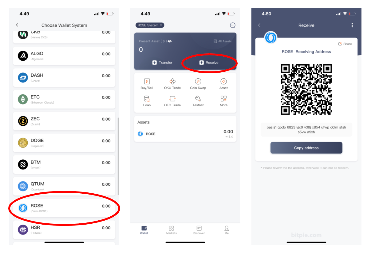 ROSE토큰 선택 후 Receive 탭을 터치하면 oasis로 시작하는 월렛 주소가 나오는데, 이 주소를 코인리스트에서 등록해주어야 합니다. (Bitpie월렛의 복구 문구를 꼭 잘 저장해두셔야 합니다)