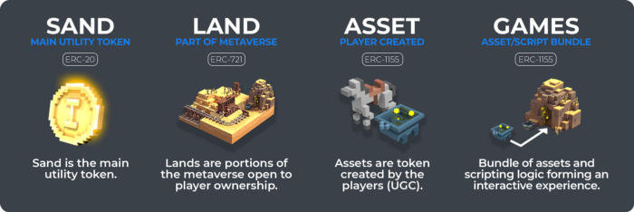 - 더 샌드박스에는 ERC20토큰인 SAND, ERC721토큰인 LAND, ERC1155토큰인 ASSET 및 GAMES 등 3가지 종류의 이더리움 토큰 표준이 사용됩니다.