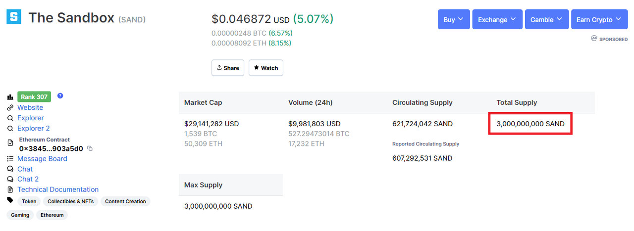 - SAND토큰의 총 발행량은 3,000,000,000개(30억 개)입니다.