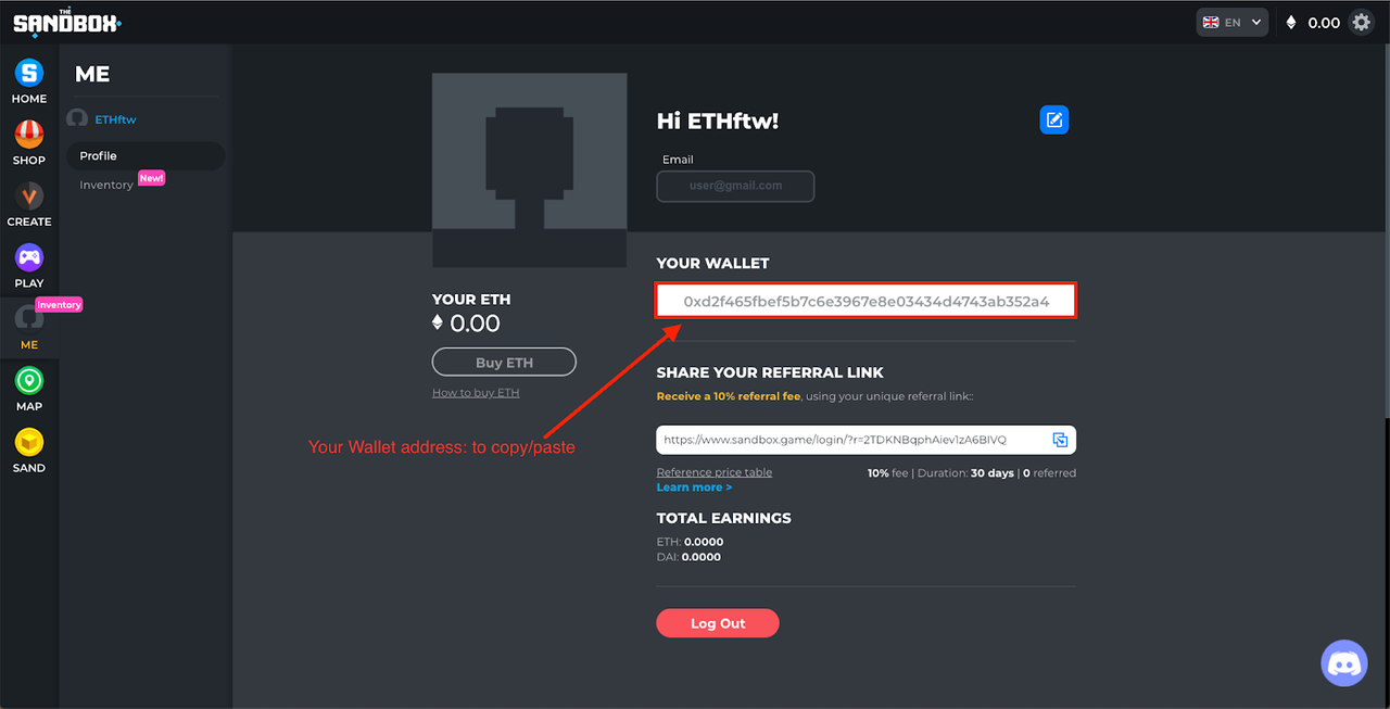 더 샌드박스 플랫폼의 내 지갑 주소는 https://www.sandbox.game/en/me/ 로 접속하시거나, 메인 화면에서 좌측에 [ME] 탭을 클릭하면 확인이 가능합니다.