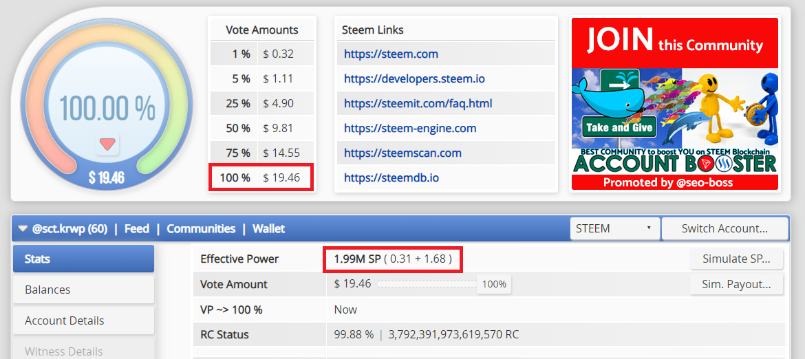 그동안 어느 정도 스팀잇을 해오셨고 스팀엔진도 십분 활용하실 수 있다면 보상으로 받은 STEEM이나 TRX를 KRWP로 변환하고 @sct.krwp 계정으로부터의 보팅을 받는 것도 굉장히 좋은 방법입니다.