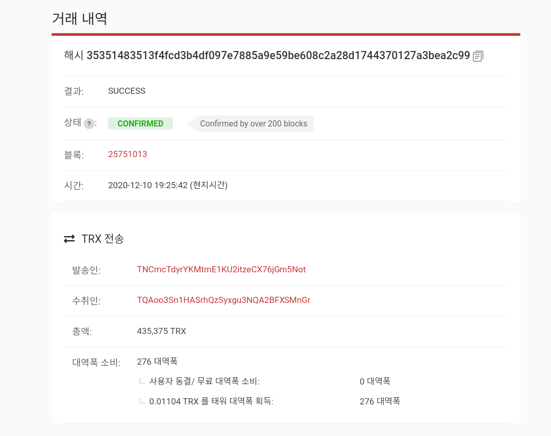 - TRX 재고보충 트랜잭션 : https://tronscan.org/#/transaction/35351483513f4fcd3b4df097e7885a9e59be608c2a28d1744370127a3bea2c99