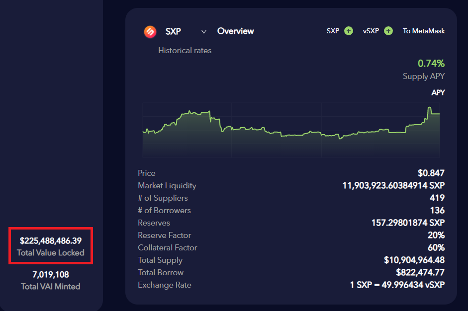 현재 비트코인, 이더리움, 리플, 라이트코인, 바이낸스코인, 스와이프, 비너스, 스테이블코인 3종(USDT, USDC, BUSD)의 예치 및 대출 기능을 제공하고 있는 비너스 프로토콜에는 총 2억 2,548만 달러가 락업이 되어 있으며 스테이블코인 VAI도 700만 달러 어치가 발행이 된 것을 확인할 수 있습니다.