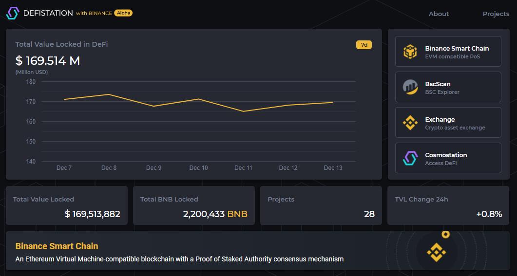 아직 비너스 프로토콜의 경우 디파이스테이션에서 바이낸스 스마트체인 기반 DeFi 프로젝트들의 전체 락업자산 데이터 집계에서 누락이 되어 있는 관계로, 바이낸스 스마트체인 디파이 프로젝트들의 락업자산 규모도 실제보다 과소평가가 되어 있는 상황인데, 현재까지의 데이터에 비너스 프로토콜이 포함되는 경우 현재의 2배 이상으로 큰 데이터 변동이 생기게 됩니다.