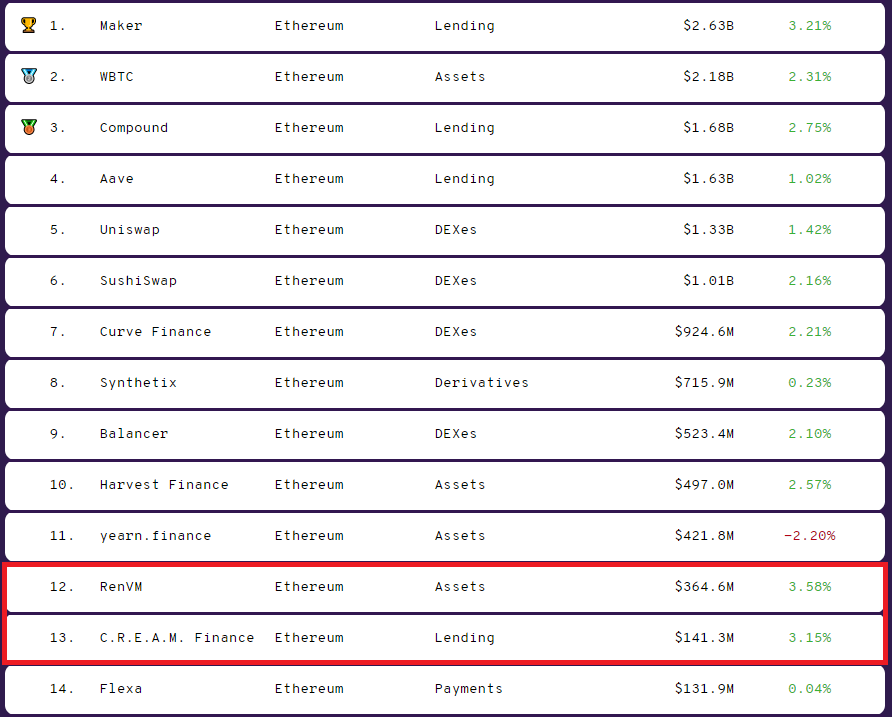 그냥 저 수치만 보더라도 꽤나 엄청난 금액이 단기간에 몰리고 있다는 것을 확인할 수 있지만, 다른 데이터들과 비교해서 보면 그 크기를 실감하기가 더 좋은 것 같습니다. 이 총 락업자산의 규모는 이더리움의 주요 디파이 프로토콜들과 비교했을 때 13위에 해당하는 엄청난 기록이기도 하고,