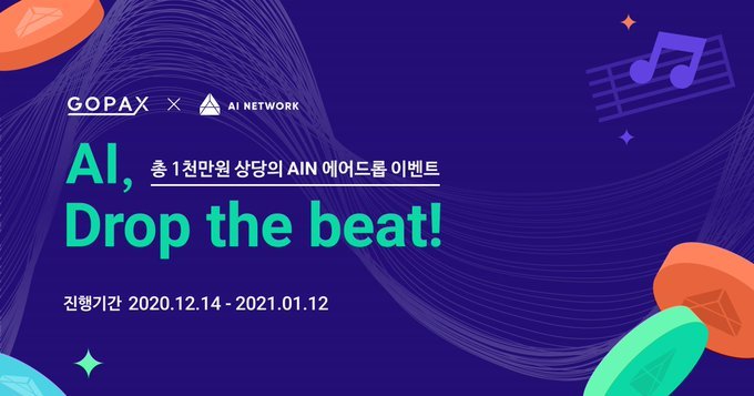 안녕하세요, 디온입니다. 지난 2019년 7월에 고팍스에 상장되었던 AI Network 프로젝트팀에서 고팍스와 함께 총 1천만원 상당의 AIN 에어드랍 이벤트를 진행합니다. 이번 이벤트에는 많은 분들께서 크게 관심을 가지지 않을 고팍스에서의 거래량 이벤트도 포함되어 있으나, [이벤트2]에 해당하는 AI, Drop the Beat! 이벤트에는 참여해보실 것을 추천드립니다.