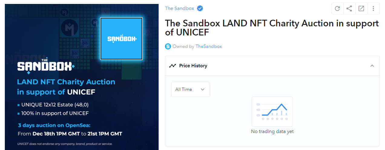 해당 이스테이트는 더 샌드박스 팀에게 소유권이 있었던 지역으로 입찰에 당첨된 사용자에게 소유권이 이전되며, 판매 수익금(SAND)은 유니세프에 전액 기부됩니다. 이번 LAND NFT 자선경매는 대체불가토큰을 활용한 유니세프의 첫 모금활동이라는 점에서도 큰 의미를 가지게 될 것으로 보입니다.