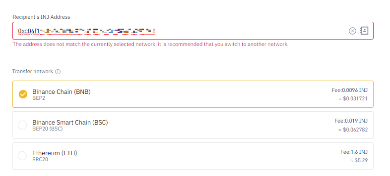 그런데, 업비트에서는 입금주소를 생성하면 별도로 네트워크를 선택하지 않고 자동으로 입금주소가 생성되는 반면에 바이낸스에서 코인을 출금하려다보면 위와 같이 Transfer network를 선택하라는 화면이 나옵니다.