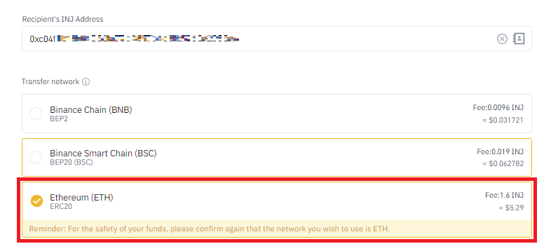 위와 같이 입금주소 발급 시에는 해당 코인이 어떤 네트워크를 사용하는지에 대한 표기가 되어 있는데, 대다수가 ERC-20으로 표기가 되어 있으며 이 경우에는 바이낸스에서 무조건 이더리움 네트워크를 선택해야 합니다.