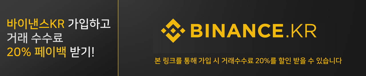 혹시라도 아직까지 바이낸스KR거래소 계정이 없으신 경우, 아래의 배너를 클릭하여 바이낸스KR에 가입을 하시면 거래수수료의 20%를 페이백 받으실 수 있으며, 10달러 이상 거래 시 0.2 BNB를 추가로 받으실 수 있습니다. 본 포스팅이 도움이 되셨다면 아래의 링크로 가입을 부탁드립니다^^