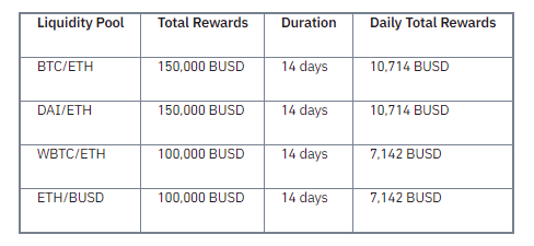 대상 유동성 풀에 유동성을 공급하는 사용자는 거래수수료 및 자율저축상품 이자에 추가적으로 500,000 BUSD를 에어드랍 받을 수 있습니다. 그리고 총 보상액은 BTC/ETH와 DAI/ETH풀이 가장 높게 책정되어 있습니다.