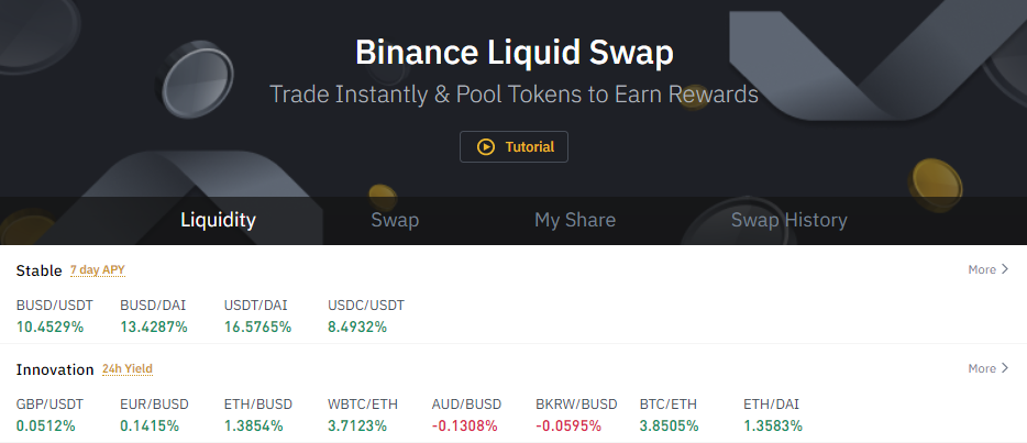 리퀴드 스왑(Liquid Swap) 또는 비스왑(BSwap)이라고도 부르는 바이낸스 리퀴드 스왑(Binance Liquid Swap)은 중앙화된 방식의 최초의 스테이블 코인 AMM으로 바이낸스 거래소 사용자들이 지갑 내에 보유 중인 다양한 종류의 스테이블코인, 페깅법정화폐, 랩트비트코인(WBTC), 이더리움(ETH) 등을 즉시 변환할 수 있는 서비스입니다.