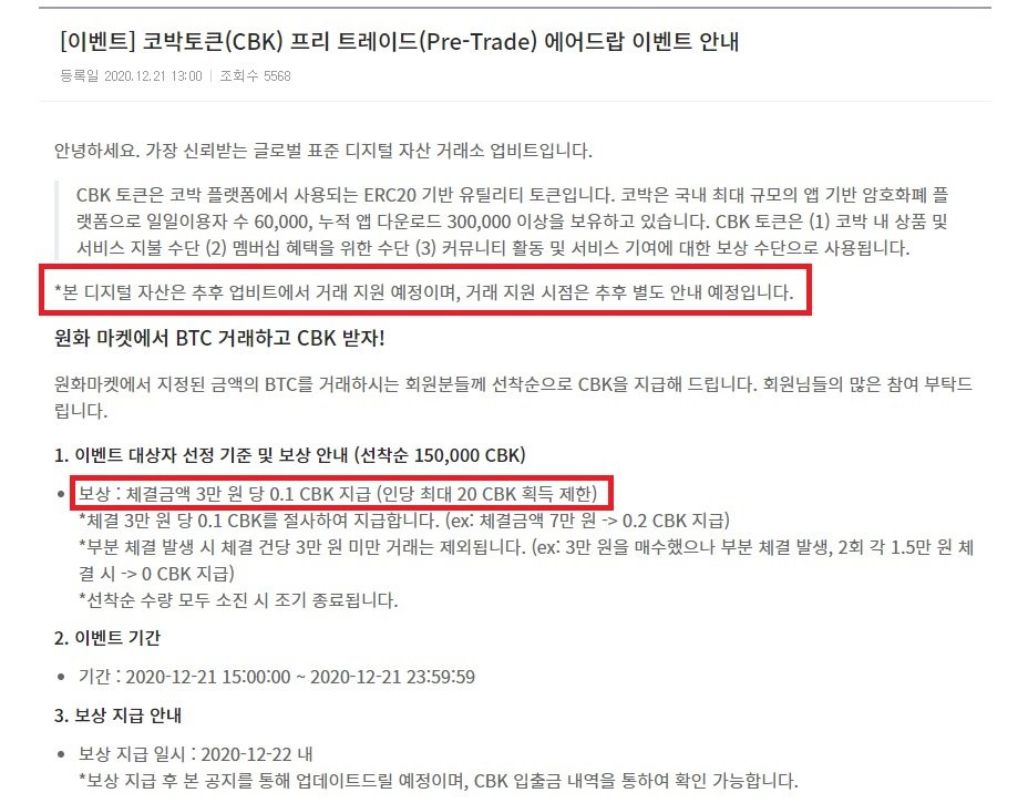 위의 공지에서 안내된 것처럼 CBK는 업비트 상장이 확정되었으며, MBL토큰 홀더 대상 에어드랍과는 별개로 업비트에서 프리 트레이드 에어드랍 이벤트를 진행합니다.