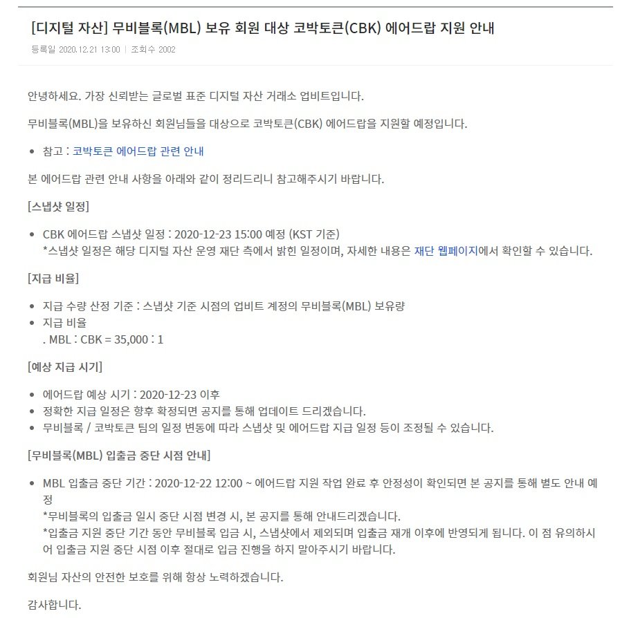 오늘 업비트에서는 공지를 통해 2020년 12월 23일 15:00 경에 MBL토큰 홀더의 스냅샷 후 CBK에어드랍을 진행한다는 소식과 함께 업비트에서 CBK토큰의 거래를 지원할 예정이라는 소식을 알렸습니다.