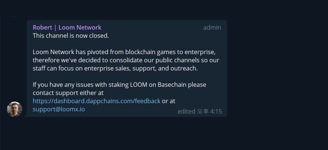 안녕하세요, 디온입니다. 이더리움의 Layer-2 사이드체인 확장성 솔루션으로 크립토좀비 등 다양한 블록체인 기반 게임 개발을 주도해왔었던 Loom Network의 공식 텔레그램 채널이 공식적인 운영 중단을 선언했습니다.