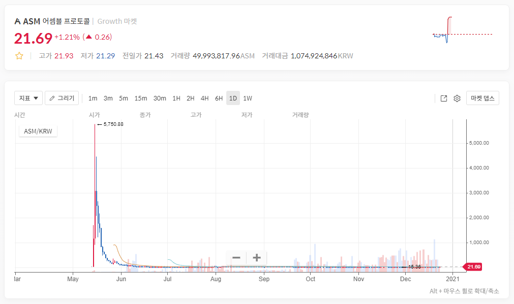 현재 약 21~22원 사이에서 거래되고 있는 어셈블 프로토콜은 코인원 최초 상장 시 약 5,700원 선까지 펌핑이 되었다가 며칠 못 버티고 계속해서 덤핑이 되면서 현재는 약 50토막이 나버린 가격에서 사실상 봇 거래만 있다고 봐도 무방할 것 같네요.