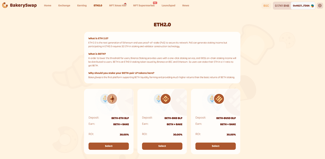 바이낸스에서는 바이낸스 스마트 체인 기반의 디파이 플랫폼인 베이커리스왑(BakerySwap)에서 BETH페어에 유동성을 제공하는 사용자들에게 ETH 2.0 스테이킹 보상과 함께 100,000달러 상당의 BAKE토큰 보상을 추가로 제공합니다.