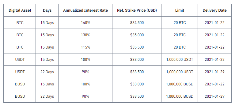 이번으로 24회차를 맞이하는 바이낸스 듀얼 세이빙즈는 오늘 오후 1시부터 선착순으로 모집이 시작되었으며, 1월 22일 만기인 행사가 34,500달러의 BTC의 경우에는 APY가 무려 140%입니다. 혹시라도 관심이 있으신 분들은 참고하시기 바랍니다.