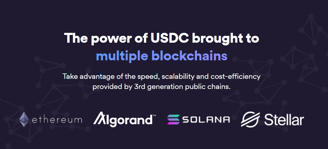 그러나, 현재 상태에서의 이더리움은 모든 은행들의 결제 업무를 원활하게 처리할 수 없는 수준이고, 결국에는 이더리움 네트워크의 병목현상이 발생하는 경우 이를 보완하는 다른 퍼블릭체인이 필요합니다. 그래서 일찍이 써클에서는 USDC를 이더 뿐만 아니라 알고랜드, 쏠라나, 스텔라루멘 등 가볍고 빠른 블록체인에도 올리고, 기업들이 사용할 수 있는 API를 제공하고 있습니다.