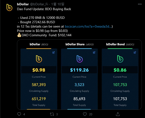 [DeFi] 알고리즘화 스테이블코인과 Elastic Supply 토큰들의 몰락 포스팅을 올린 당일에 bDollar.fi에서는 확보 중인 DAO Fund를 활용하여 270BNB와 12,000 BUSD에 해당하는 BDO를 바이백하며 지속적인 BDO의 하방 압력을 저지하였고, 해당 DAO Fund에 102,144달러에 해당하는 자산이 있다는 점과 업데이트된 Bond 시스템이 작동하면서 다시 TVL이 증가하는 추세로 돌아서고 있습니다.