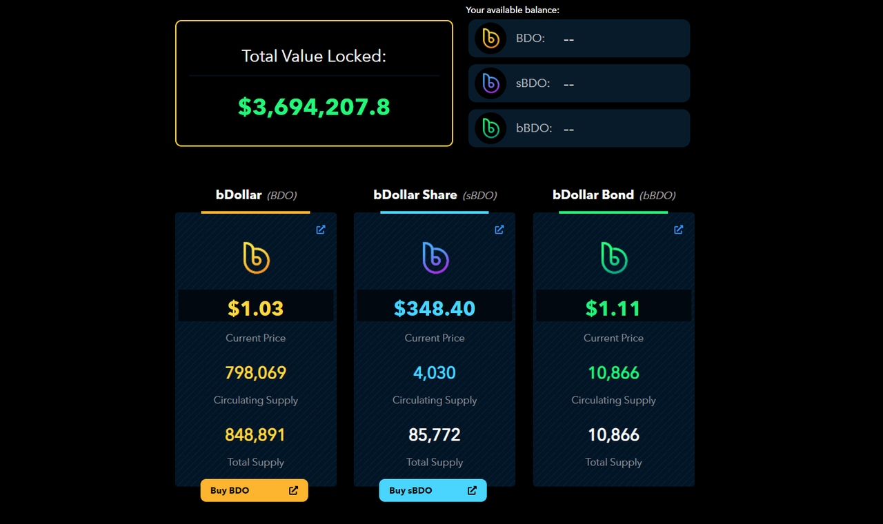 안녕하세요, 디온입니다. 잠시 알고리즘 스테이블코인인 BDO의 가격이 1달러 미만으로 붕괴가 되면서 위기 상황에 처했던 바이낸스 스마트 체인 기반의 베이시스 캐시 포크 프로젝트인 비달러파이(bDollar.fi)가 DAO community fund 재원을 활용한 바이백 이후 다시 안정화된 상태로 돌아오고 있는 모습입니다.