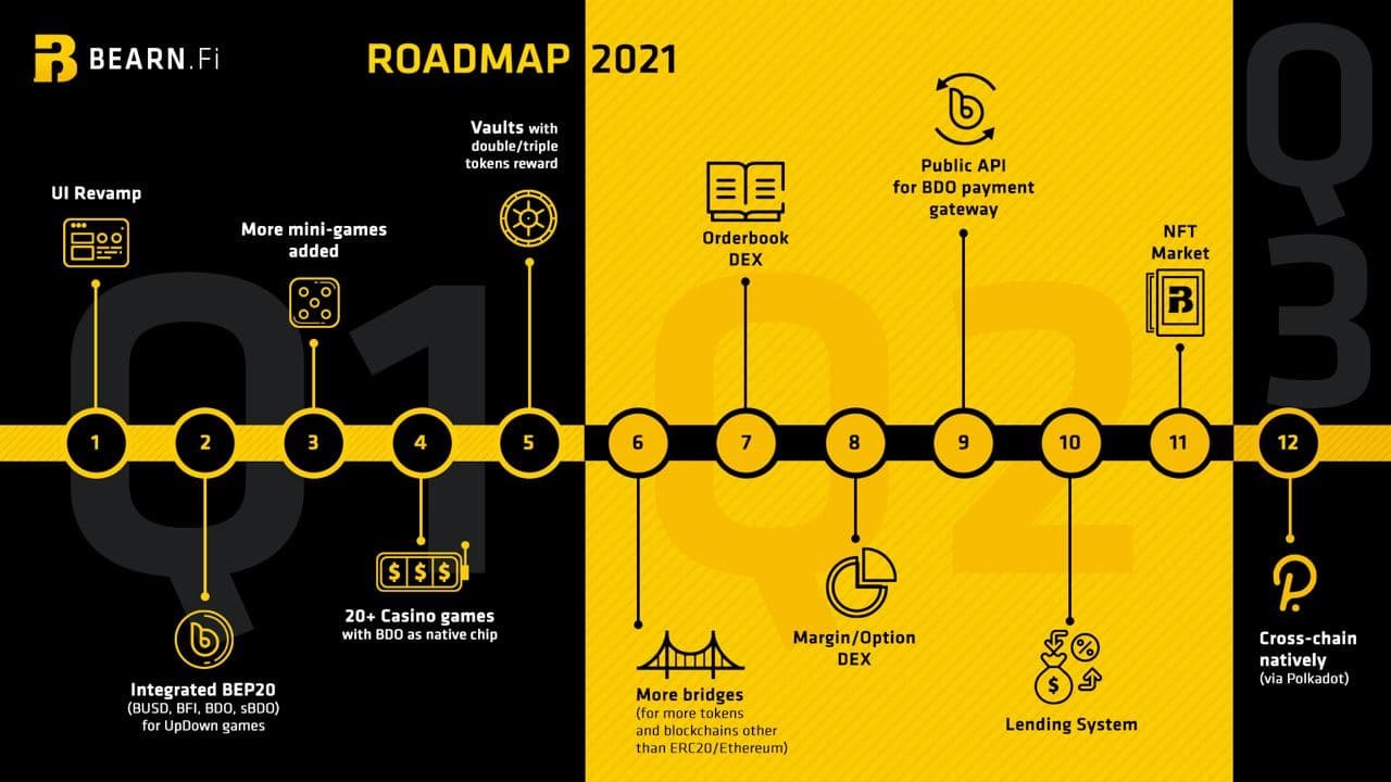 지금까지 경험을 해보면 디파이들의 기본적인 로드맵이나 발전방향들은 다들 비슷한 것 같습니다. 일단은 토큰들을 활용할 수 있는 미니게임을 출시하여 유틸리티를 높이고 이와 동시에 소각 메커니즘을 적용하고, 그 다음에는 스테이킹 유도 시스템(vault), 현물DEX, 파생상품DEX, 렌딩 마켓, NFT, 크로스체인(멀티체인) 지원 루트를 따르는 것이 대부분이고 비달러파이(비언파이낸스) 또한 동일한 로드맵을 내놓았습니다.