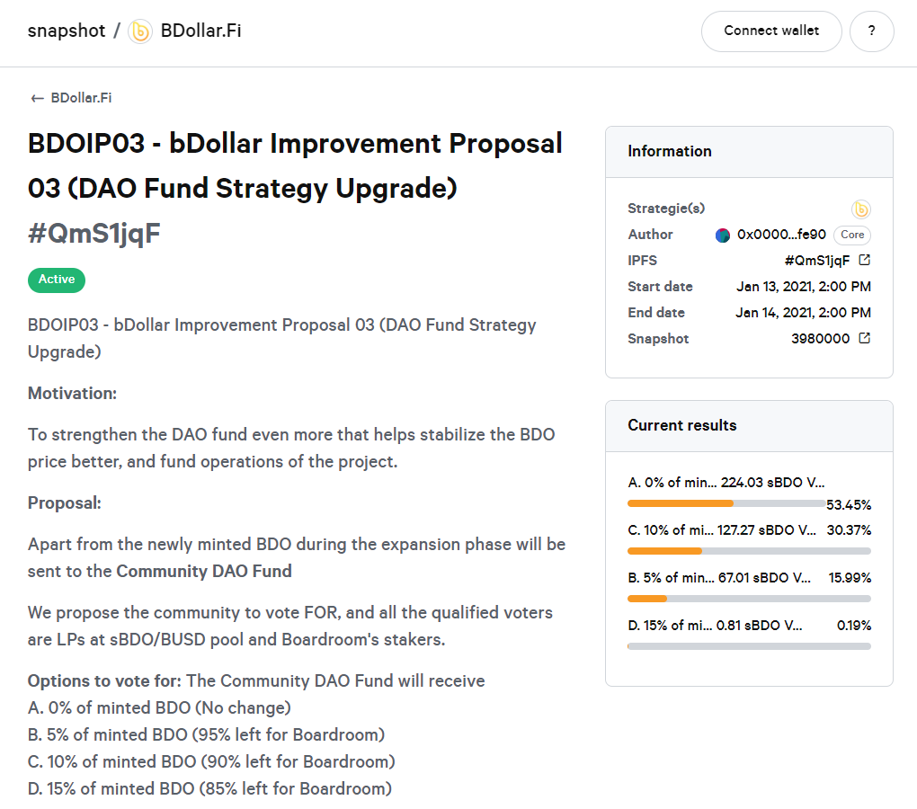 - 투표 페이지 : http://vote.bdollar.fi/#/bdollar.eth/proposal/QmS1jqFBR2baxfrxTzS5NT952e4xBULVi1EJbErgeuGjKy