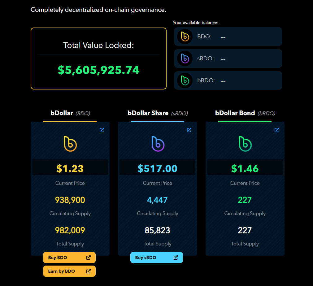 안녕하세요, 디온입니다. 바이낸스 스마트 체인 기반 최초의 알고리즘 스테이블코인(Algorithmic stablecoin) 프로젝트인 bDollar.fi의 스테이블코인인 BDO는 1달러 이상으로 유지되고, 지분 토큰인 sBDO의 가격은 500달러를 다시 돌파하면서 총 락업자산 규모(TVL)도 다시 500만 달러를 탈환하고 있습니다.