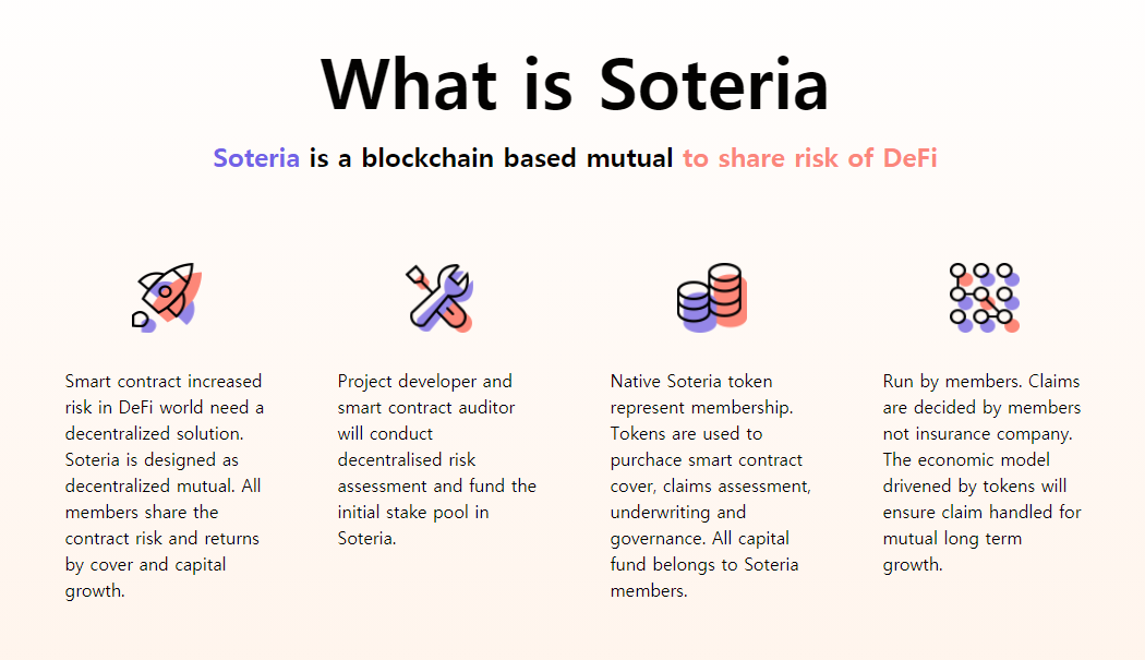 Soteria는 바이낸스 스마트 체인 기반 최초의 리스크 셰어링 뮤추얼 펀드 풀로 DeFi 사용자들을 위한 탈중앙화된 보험 플랫폼입니다. 사용자들은 누구나 Soteria 멤버십에 가입하여 커버리지를 구매하여 해킹 등으로 인한 리스크를 크게 줄일 수 있습니다. 우리가 일상에서 흔히 접하는 보험과 거의 유사하지만 토큰 홀더들이 리스크 평가, 청구 금액 평가 등과 같은 활동에 참여하고 거버넌스 활동에 참여하는 데 대한 경제적 인센티브를 제공한다는 점에서 차이가 있습니다.