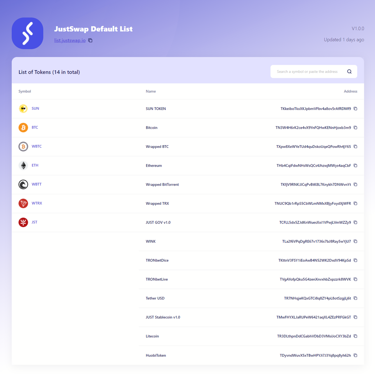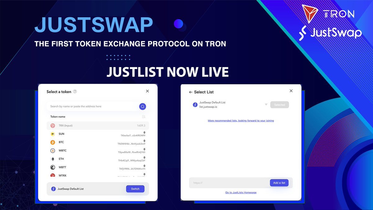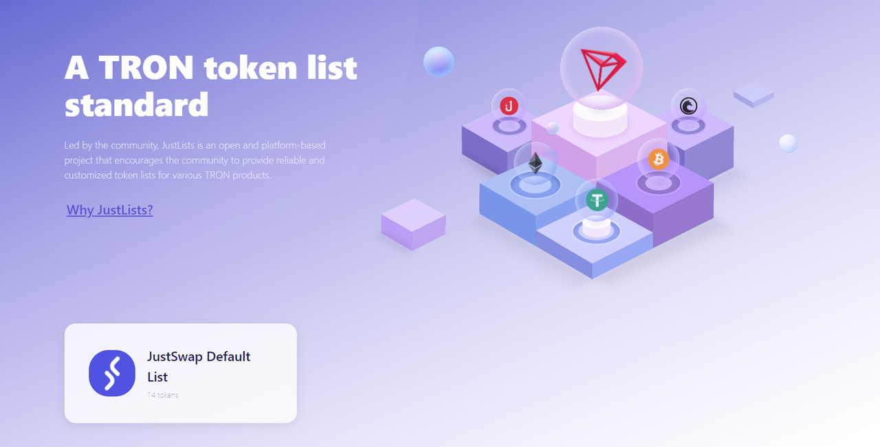 안녕하세요, 디온입니다. 저스트스왑을 비롯하여 하나 이상의 TRC20 토큰 리스트가 필요한 여러 디앱 인터페이스에서 사용할 수 있는 토큰 메타 데이터(주소, 심볼, 이름 등) 리스트를 만들고 관리할 수 있는 JustLists가 출시되었습니다.