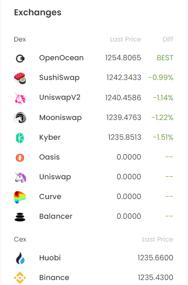 프로 베타 버전은 위에서 볼 수 있는 것처럼 현재는 이더리움, 바이낸스 스마트 체인, 온톨로지를 지원하고 있으며, 각 체인들에 존재하고 있는 다른 DEX들 및 바이낸스, 후오비와 같은 CEX에서의 가격 정보를 한꺼번에 확인할 수 있다는 점이 정말 편리합니다.