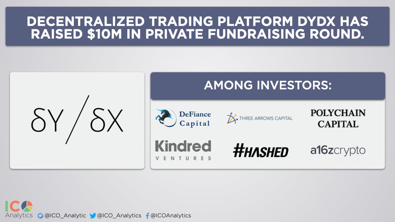 안녕하세요, 디온입니다. 2018년에 안드레센 호로위츠와 폴리체인이 리드한 시드 펀딩에서 20억 원을 모금한 바 있는 이더리움(ETH), 다이(DAI) 기반의 탈중앙화 마진거래소 dYdX가 이번에는 Three Arrows Capital과 DeFiance Capital이 리드한 시리즈B 라운드에서 1,000만 달러의 투자 유치에 성공하였습니다.
