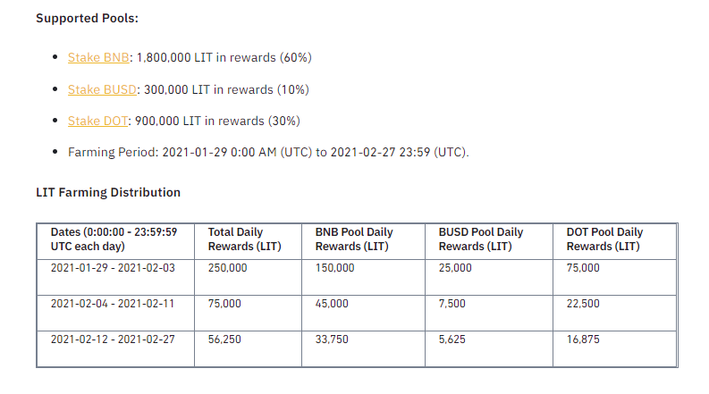 이번 런치풀도 기존과 같이 초반에 스테이킹하는 사용자들에게 더 높은 배속으로 채굴이 진행되며, 1단계 파밍기간 종료 후 2월 4일 오후 3시에 이노베이션 존에 LIT토큰이 상장될 예정입니다.