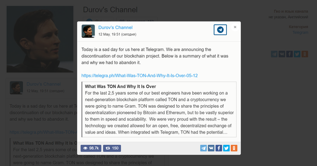 코인데스크에서는 파벨 듀로프가 Public Channel을 통해 TON프로젝트를 공식적으로 중단하겠다고 선언하였다는 코멘트만 있었고 해당 Public Channel에 대한 구체적인 링크에 대한 정보가 없었던 관계로, 아래와 같이 원문 링크를 공유드립니다.